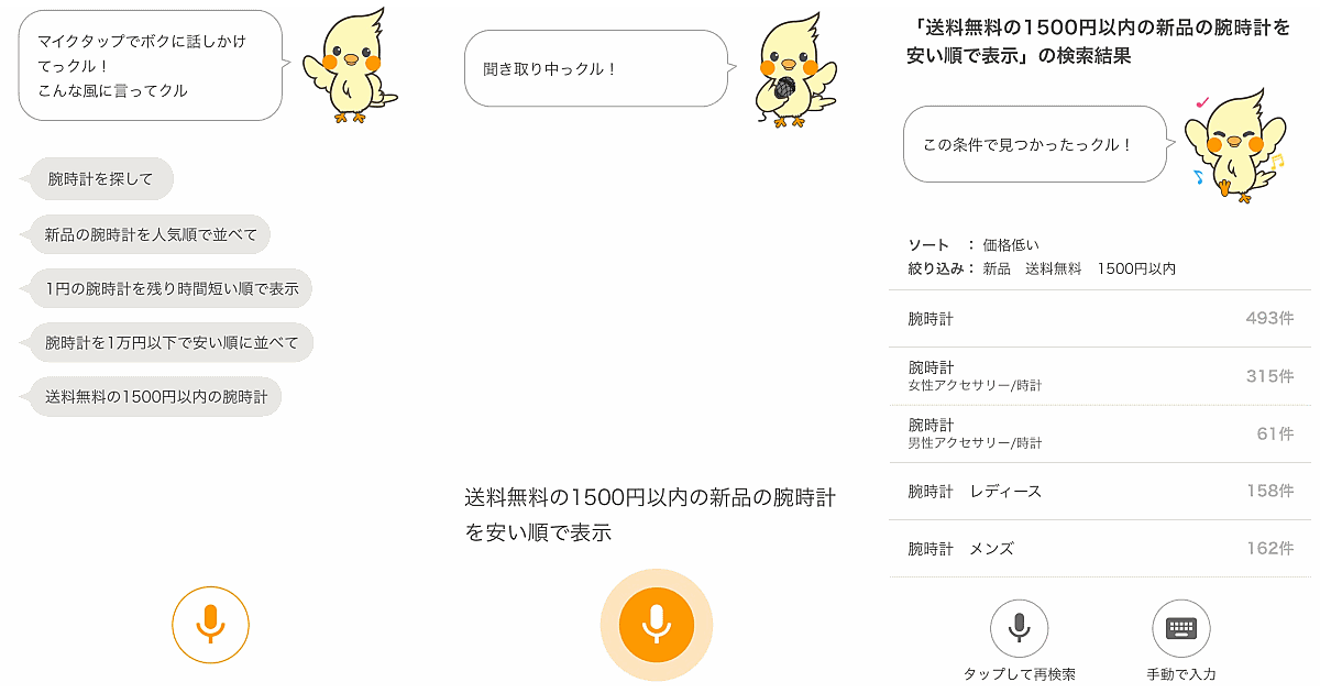 音声による商品検索アシスタント機能は、利用者が発話した内容を認識・解析することで、キーワードを手入力する手間を省く。さらに商品の表示順や価格での絞り込みなどをワンステップで行うことができる。