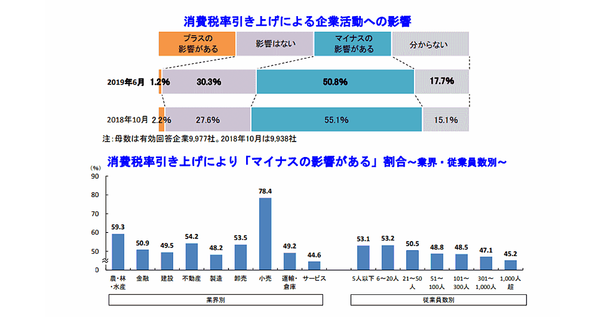 また、消費増税が企業活動に「マイナスの影響がある」と回答した企業は50.8%と過半数を占めた。
