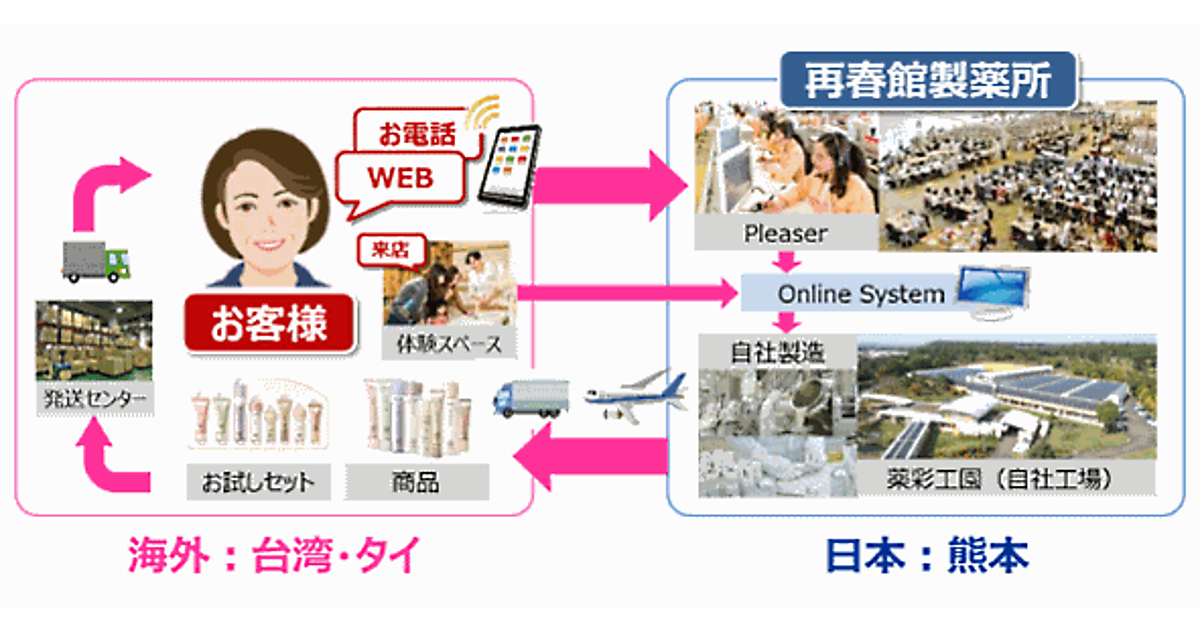 海外向けに販売する商品は、熊本県益城町内の自社工場で製造している。台湾やタイの発送拠点へ、こまめに輸送することで製品の長期保管を避けながら、注文の当日または翌日に商品を届けるという。香港や中国、他の国へは自社工場から直送している。