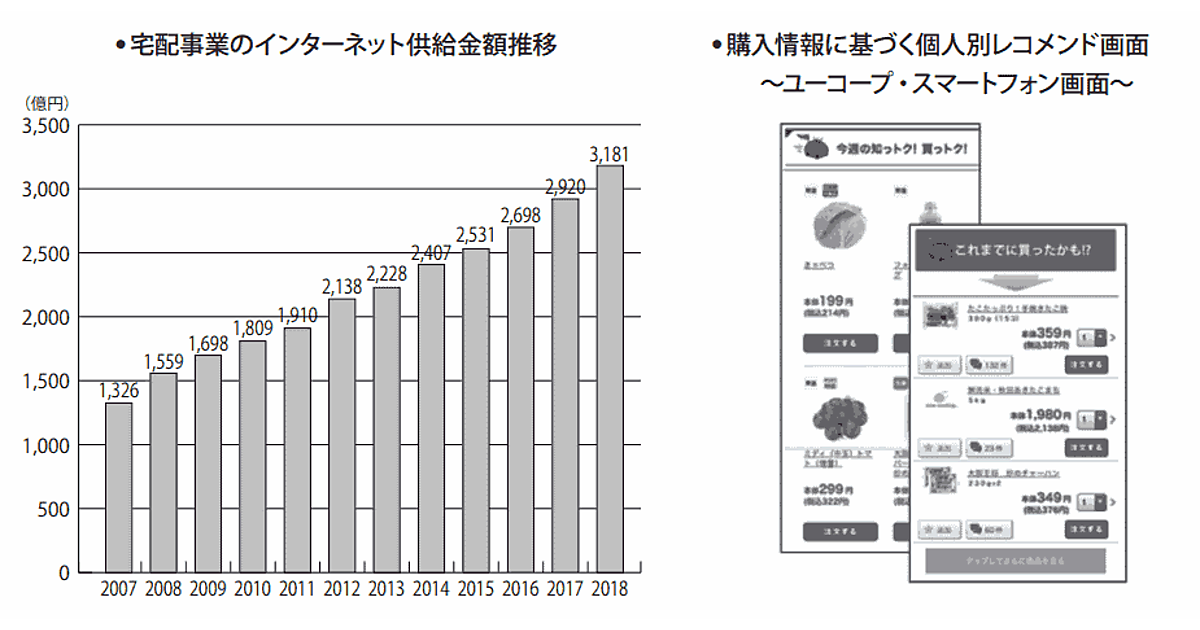 宅配事業はインターネット経由の注文が年々増加。第69回通常総会議案書参考資料によると、2018年度の宅配事業におけるインターネット経由の供給金額は、同8.9%増の3181億円。10年前と比べて約2倍に増えた。