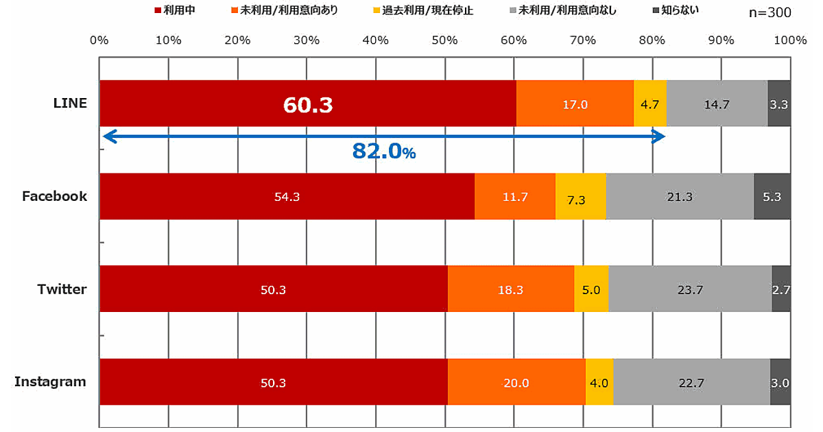今は使っていないが今後使いたい、過去に利用していたが今は使っていないを合わせると、LINEが82.0%でトップだった。