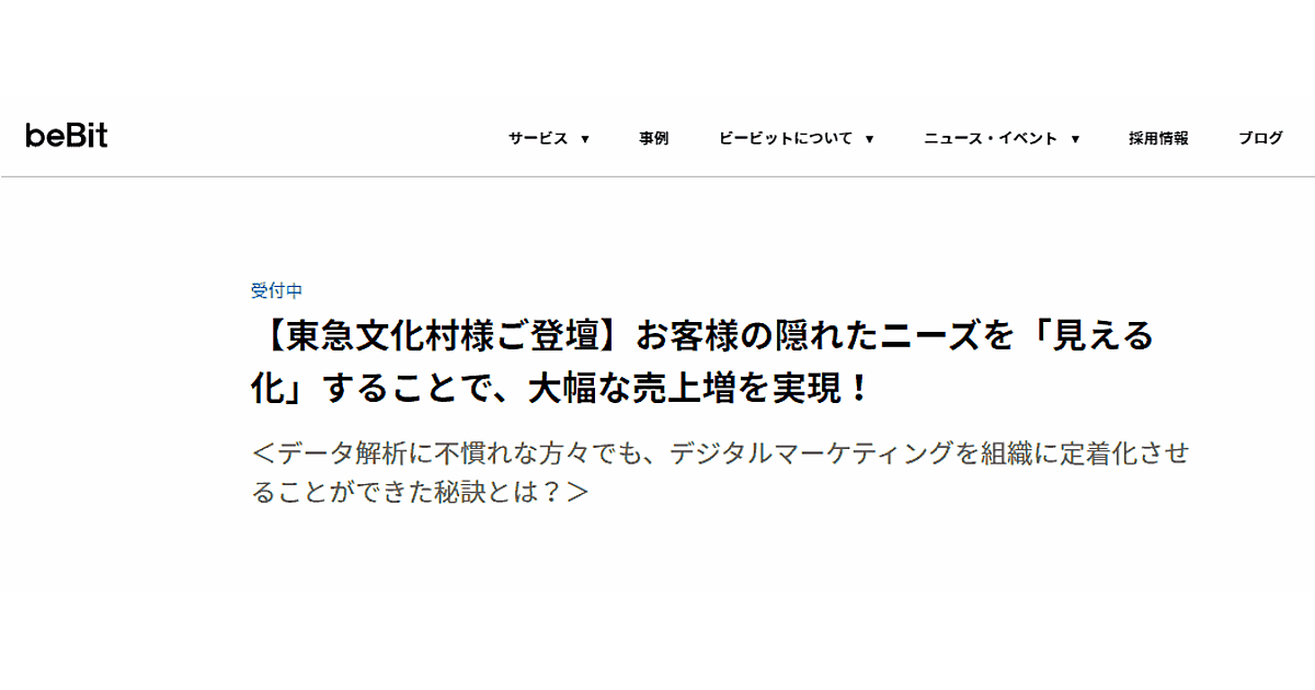 ビービットは、「お客様の隠れたニーズを『見える化』することで、大幅な売上増を実現!」と題し、東急文化村のマーケティング責任者が登壇するセミナーを9月18日(水)に東京・千代田区で開催する。