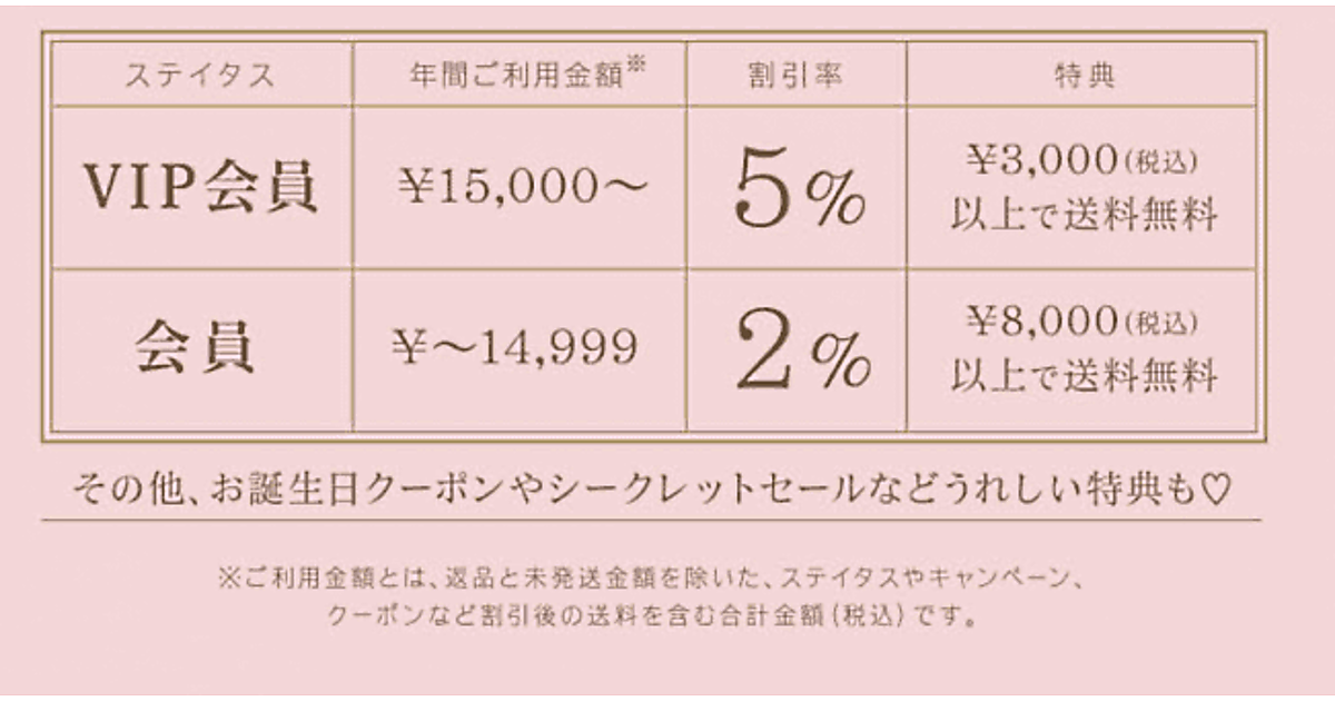 現在4段階に分けている顧客ステイタスを2段階に変更。年間購入金額が1万5000円以上の顧客を「VIP会員」とし、割引率を5%に設定するほか、税込み3000円以上の購入で送料を無料にする
