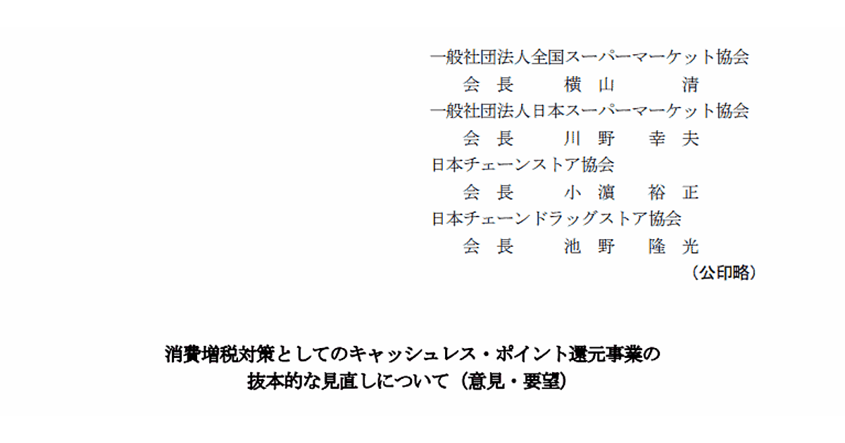 ポイント還元対象店舗の登録期限を2019年9月末で打ち切ることや、実質的な値引きとなる「即時充当」の見直し、ポイント還元の対象商品からたばこを除外することなどを要望した。その上で、2020年6月に設定されているポイント還元制度の期限を延長しないよう求めている。