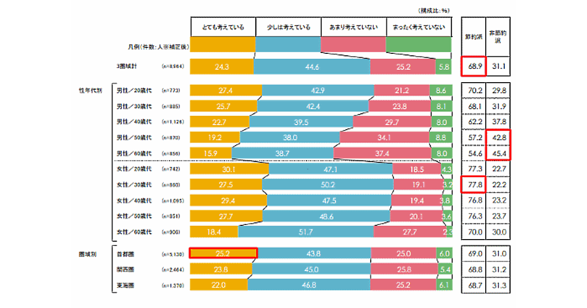 女性は30代を筆頭に「節約派」が全体で7割を超えており、女性の節約志向が強い。