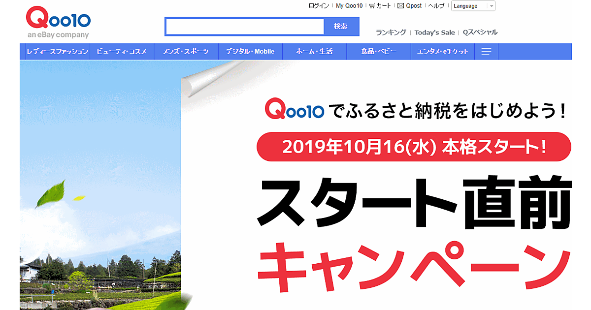 「Qoo10ふるさと納税」の開始を記念して、「最大500ポイント」が当たる「Qoo10ふるさと納税!スタート直前キャンペーン」を、サービス開始前の9月30日から10月31日まで実施する。