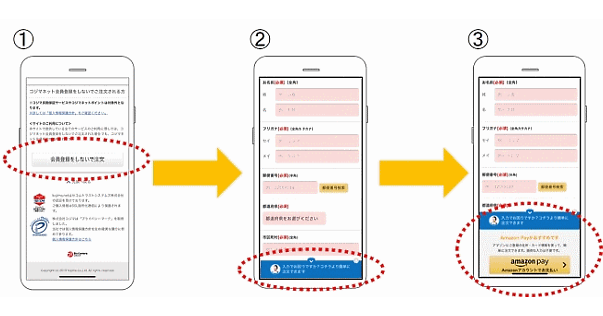 ECサイトの購入方法選択画面で「会員登録せずに購入」を選択すると、入力フォーム画面で「Amazon Pay」の利用を促すポップアップウィンドウが表示される。