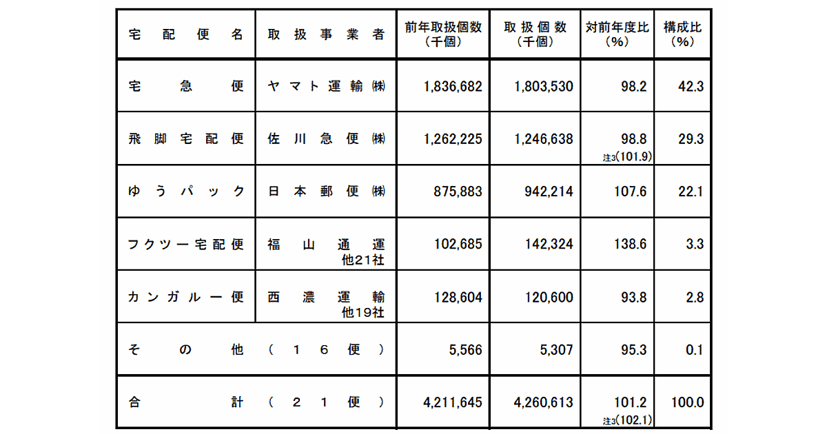 ただ、2017年度は佐川急便の取扱個数が、決算期変更に伴い376日分で集計している。従前の決算期通り2017年3月21日から2018年3月20日(365日分)で集計した場合、佐川急便の前年度比増減率は1.9%増、トラック便の合計は2.1%増となる。
