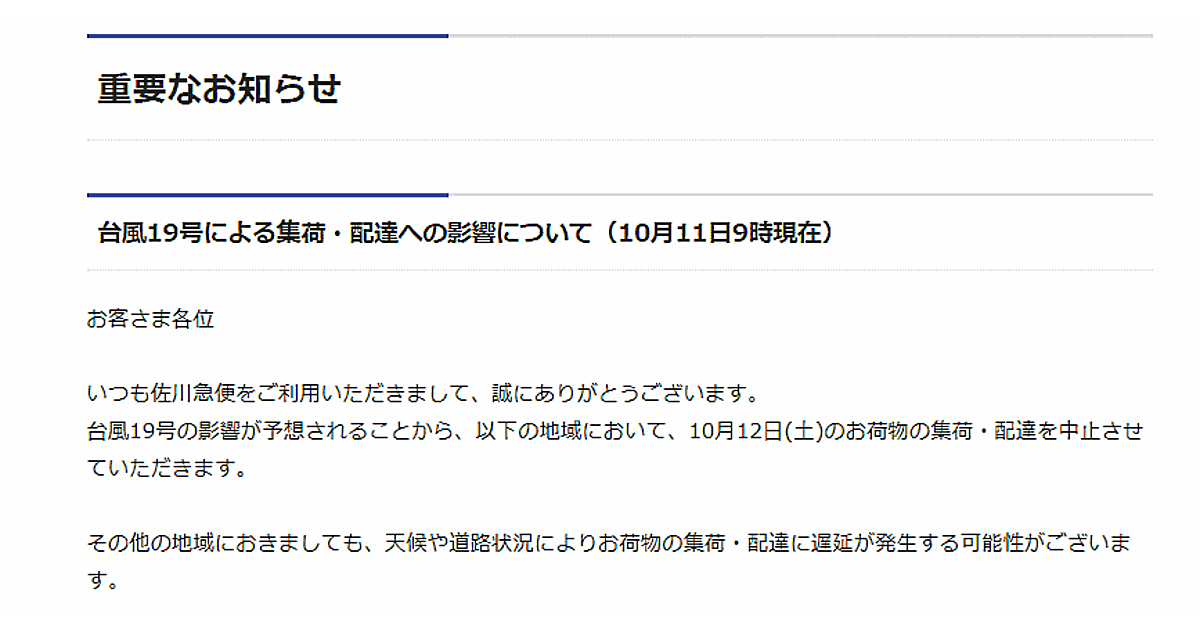 佐川急便、10/12の関東エリアなどで集荷・配達の業務を中止と発表
