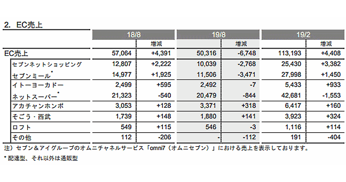 セブン&アイ・ホールディングスの2019年3~8月期(2020年2月期中間期)におけるEC売上高は、前年同期比11.8%減の503億1600万円だった。セブンネットショッピングとセブンミールの売上高が、それぞれ20%以上落ち込んだ。EC売上高の算出方法が現在の形式に変わった2016年9月以降、中間期決算におけるEC売上高の減収は初めて。