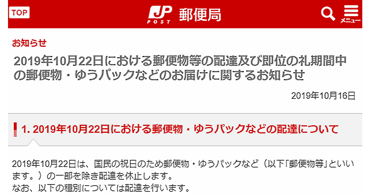 また、10月22日は国民の祝日となるため、郵便物などの一部を除き配達を休止する。ゆうパック、ゆうパケットなどの荷物の配達は行う。