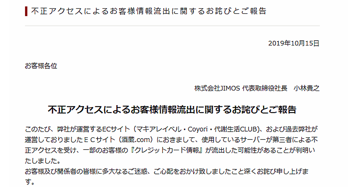 化粧品通販のJIMOSは10月15日、運営するECサイト(マキアレイベル・Coyori・代謝生活CLUB)、過去に運営していたECサイト(酒蔵.com)において、一部顧客のクレジットカード情報が流出した可能性があることが判明したと発表した。セキュリティコードも漏えいした恐れがある。