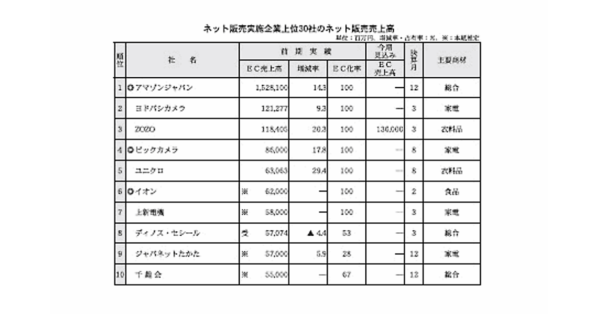 通販新聞の姉妹誌「月刊ネット販売」で2019に実施した売上高調査「ネット販売白書」によると、1位はアマゾンジャパンで1兆5281億円、2位はヨドバシカメラで1212億7700万円、3位はZOZOで1184億円500万円、4位はビックカメラグループで860億円、5位はユニクロで630億6300万円、6位にイオンが620億円(月刊ネット販売推計)が入った