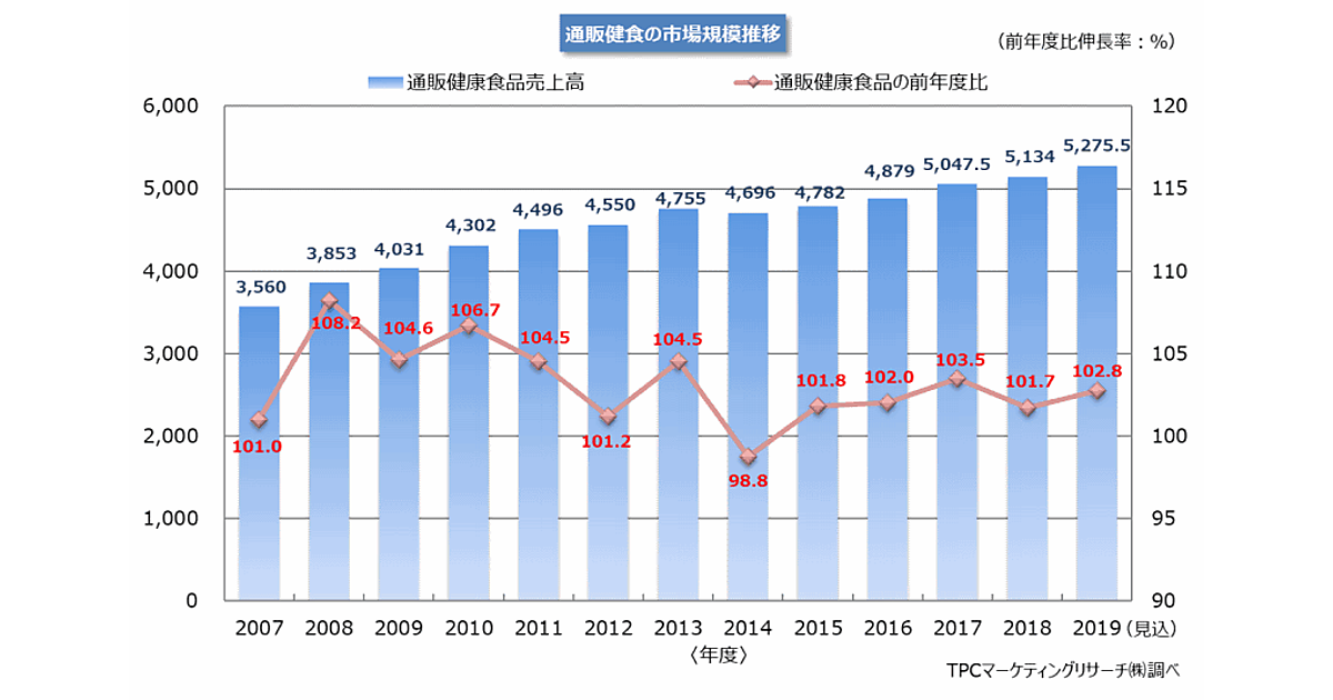 TPCマーケティングリサーチは2019年度の通販健康食品市場の見通しについて、健康志向の高まりや高齢化の進展などで血圧調節などを訴求する生活習慣病関連商品のほか、インナービューティー商品が売り上げを伸ばすと予測している。
