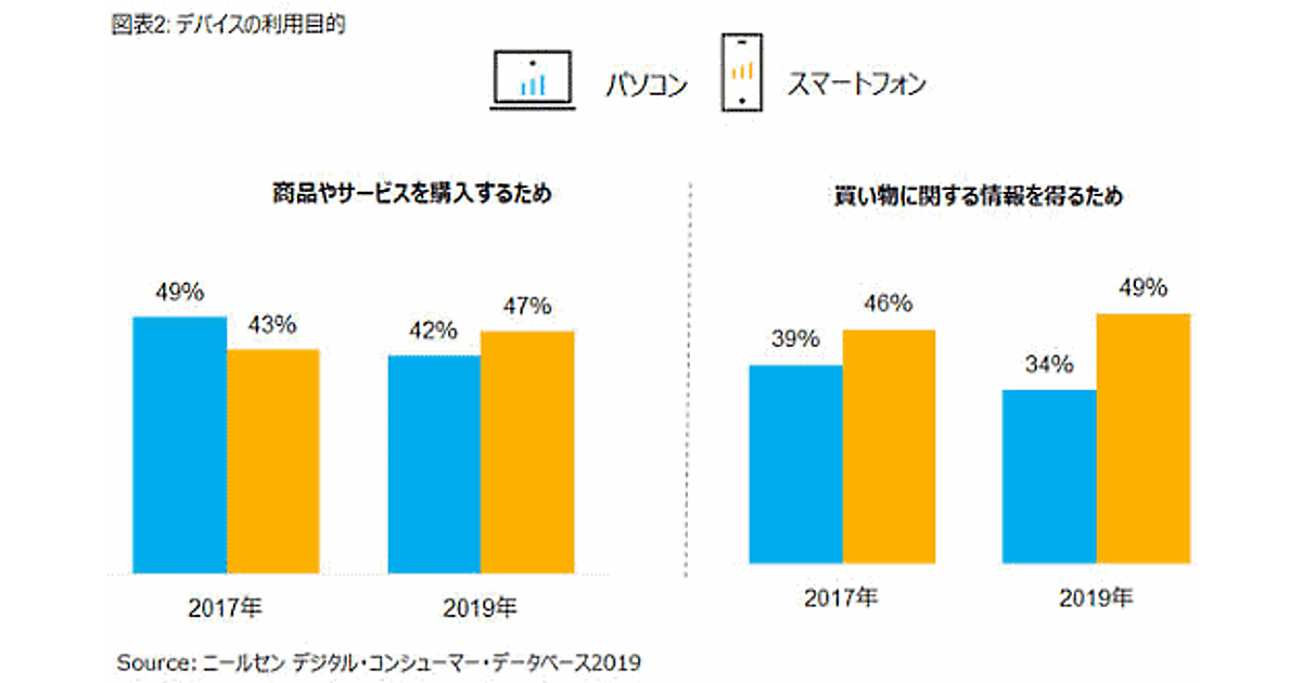 ショッピングカテゴリーに注目すると、2017年には約半数の人が「商品を購入するため」にスマートフォンよりもパソコンを利用していたのに対し、2019年の調査ではスマートフォンがパソコンを逆転した。パソコンは7ポイント減少した一方、スマートフォンは4ポイント増加している。
