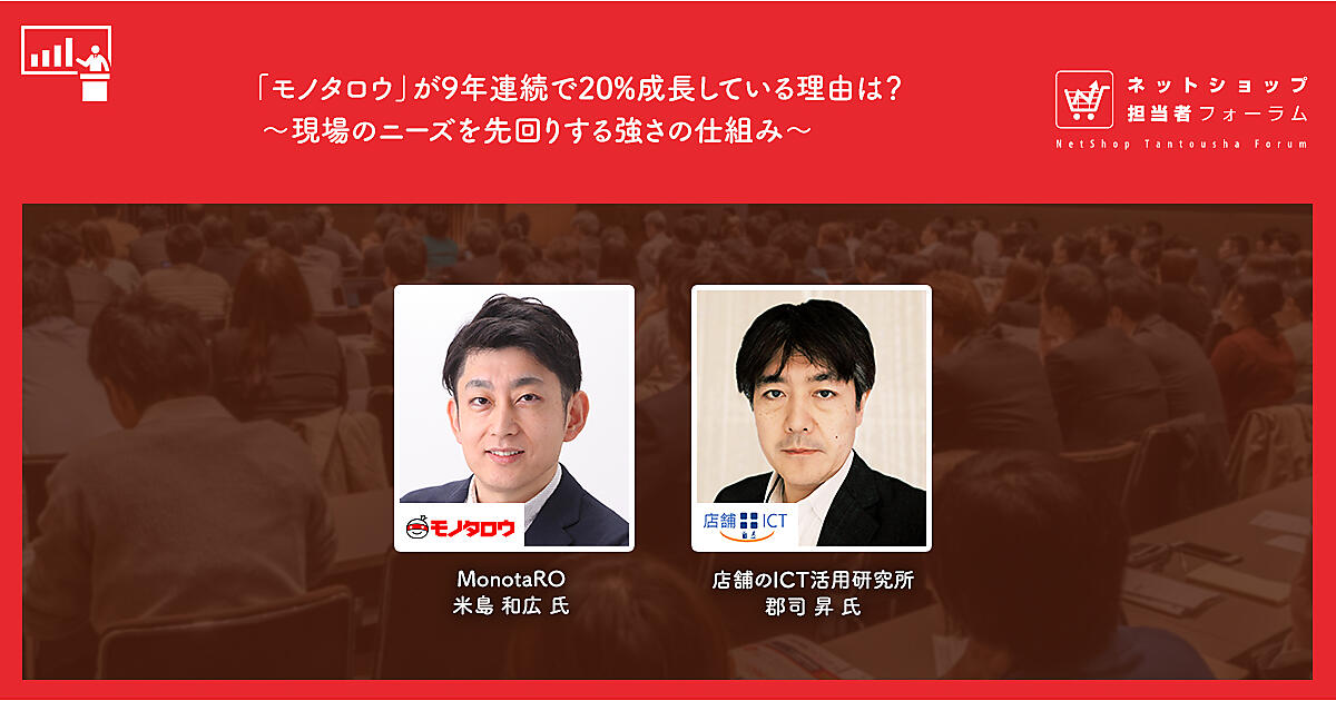 インプレスが11月12日・13日に東京・虎ノ門ヒルズフォーラムで開催する「ネットショップ担当者フォーラム2019 秋」のクロージング基調講演(12日)に登壇するのは、MonotaRoの米島和広氏(データマーケティング部門)と、店舗のICT活用研究所 代表の郡司昇氏。