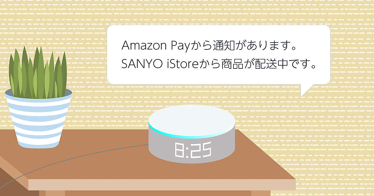 冬の寒さが近づいてきた11月上旬。三陽商会の自社ECサイト「SANYO iStore」で長袖シャツを探し、Amazon.co.jpのアカウントで決済できる「Amazon Pay」で購入。後日、商品が届くのを待っていると、「Amazon Echo Dot」のランプが点滅している。「ん、なんだ?」。「アレクサ、通知は何?」と話しかけるとこう返ってきた。「SANYO iStoreから商品が発送されました」。音声で配送状況を教えてくれるなんて、なんて便利な時代になったんだ――。