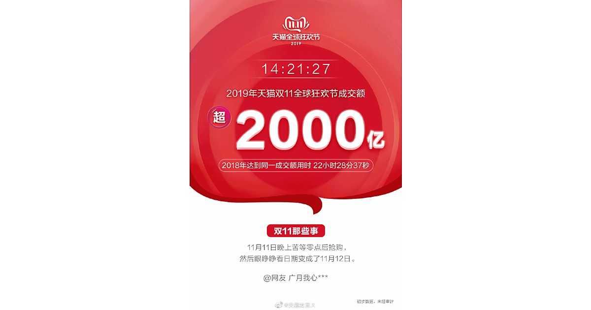 2018年は24時間で2135億元の取扱高を記録。当時のレートでは日本円で3兆4160億円となり、楽天の2017年流通総額を1日で上回る数字を記録した。なお、2019年は昨年の取扱高を大幅に上回る見通し。