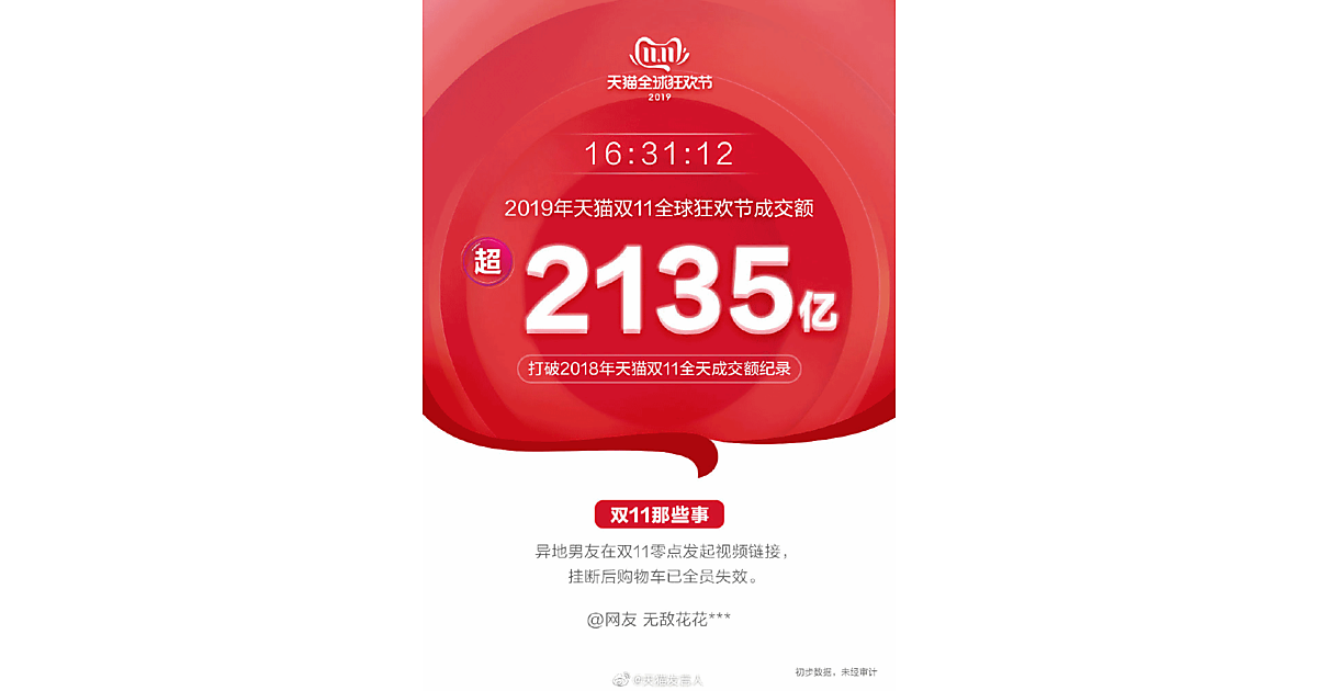中国で行われているネット通販の買い物の祭典「独身の日」(W11、ダブルイレブン)で、中国のECプラットフォーム最大手の阿里巴巴集団(アリババグループ)の取扱高(GMV)が、スタートから16時間31分12秒で2018年に記録した2135億人民元を超えた。