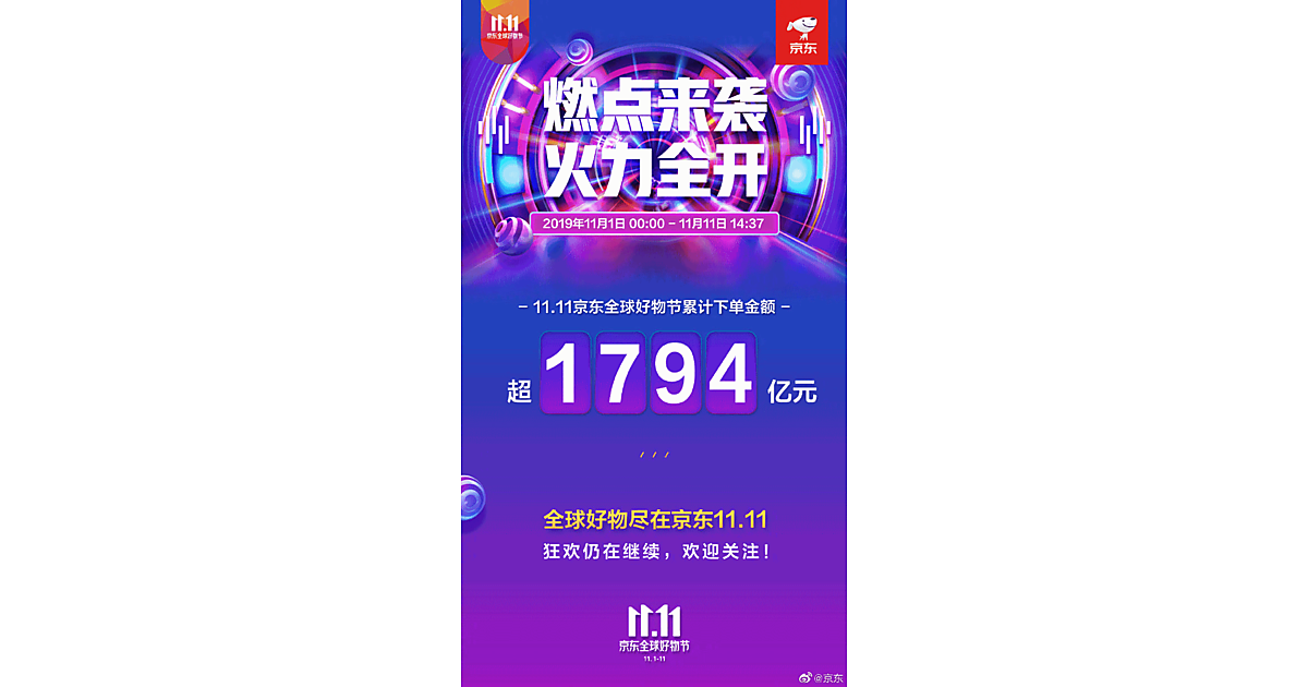中国で始まったネット通販の買い物の祭典「独身の日」(W11、ダブルイレブン)で、「JD.com」運営の中国直販EC最大手「京東集団」が展開しているキャンペーン期間中の取扱高が、11月11日14時37分に1794億人民元を突破した。