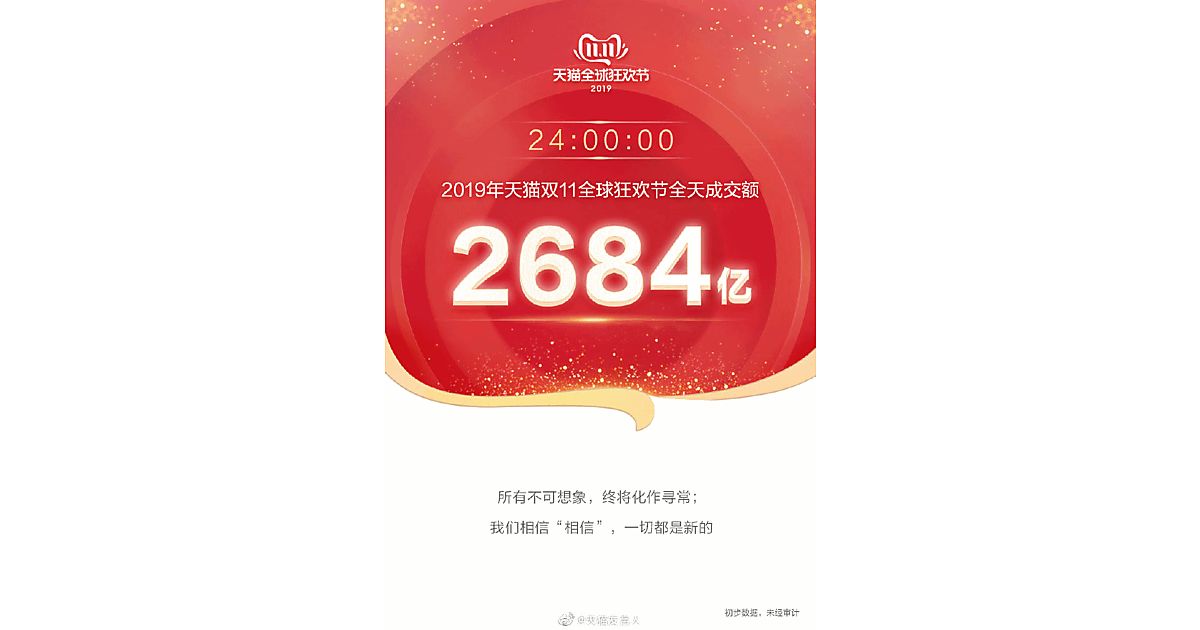 2019年は2018年実績を上回るスピードで取扱高が拡大。スタートから1時間3分59秒で1000億人民元に達し、11時間で1766億1000万人民元(252億5000万ドル)を超えた。2000億人民元を超えたのはスタートから14時間21分後。そして、スタートから16時間31分12秒後、2018年に記録した取扱高2135億円を突破した