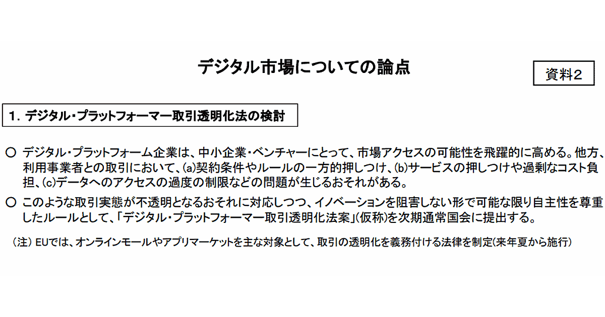 政府主導で国や地方の成長戦略を議論する「未来投資会議」は11月12日、大手ECモールなどデジタル・プラットフォーマーを規制する新たな法案「デジタル・プラットフォーマー取引透明化法案 」(仮称)について議論した。