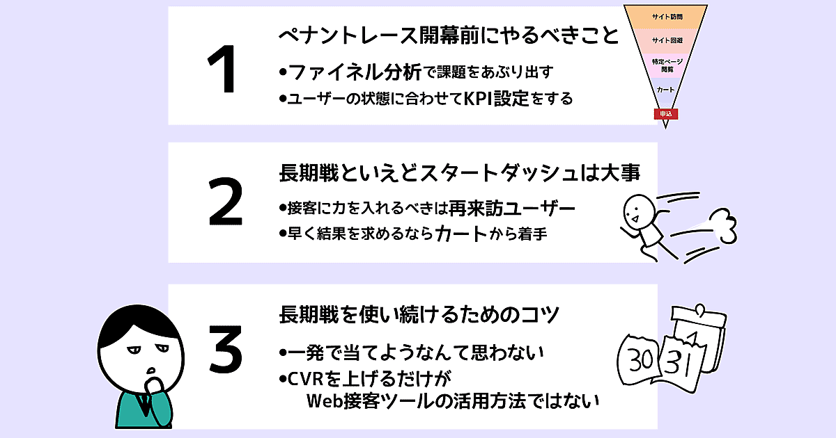 そのためには、各ポジションの選手(接客シナリオ)が、それぞれの役割の果たしながら、チーム(ECサイト)として目的を持って戦っていく必要があります。いわばチーム戦なのです。Web接客運用という、長い長いペナントレースを勝ち残って行くためにはどうしたらいいのか? 以下の3つのことをお伝えします。