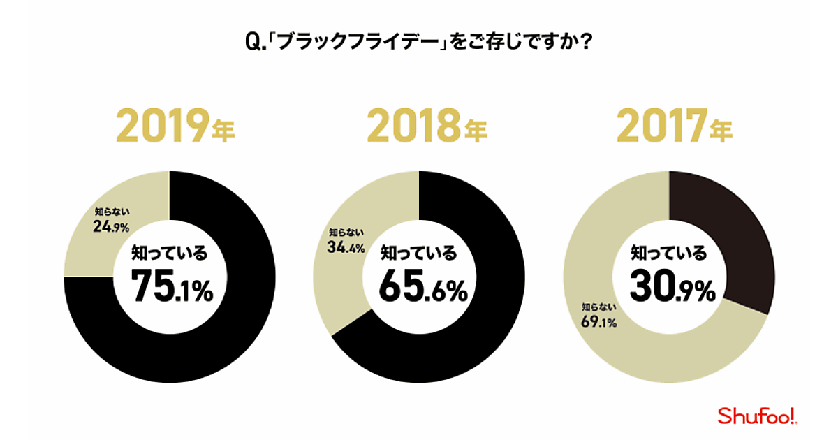 凸版印刷のグループ会社であるONE COMPATH(ワン・コンパス)が11月20日に発表した「ブラックフライデー」に関する意識調査によると、「ブラックフライデー」を「知っている」人は全体の75.1%を占め、4人に3人が知っているセールイベントとなっている。
