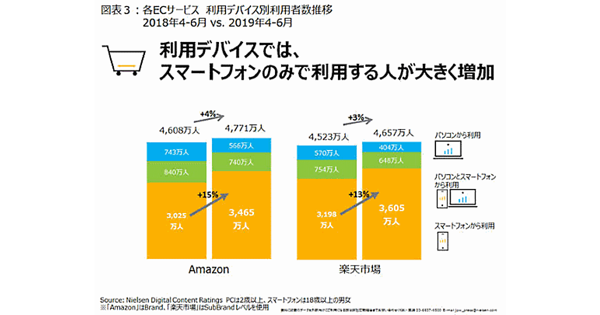 【大手ECの月間平均利用者】Amazonは4771万人、楽天市場は4657万人。スマホのみの利用者増える