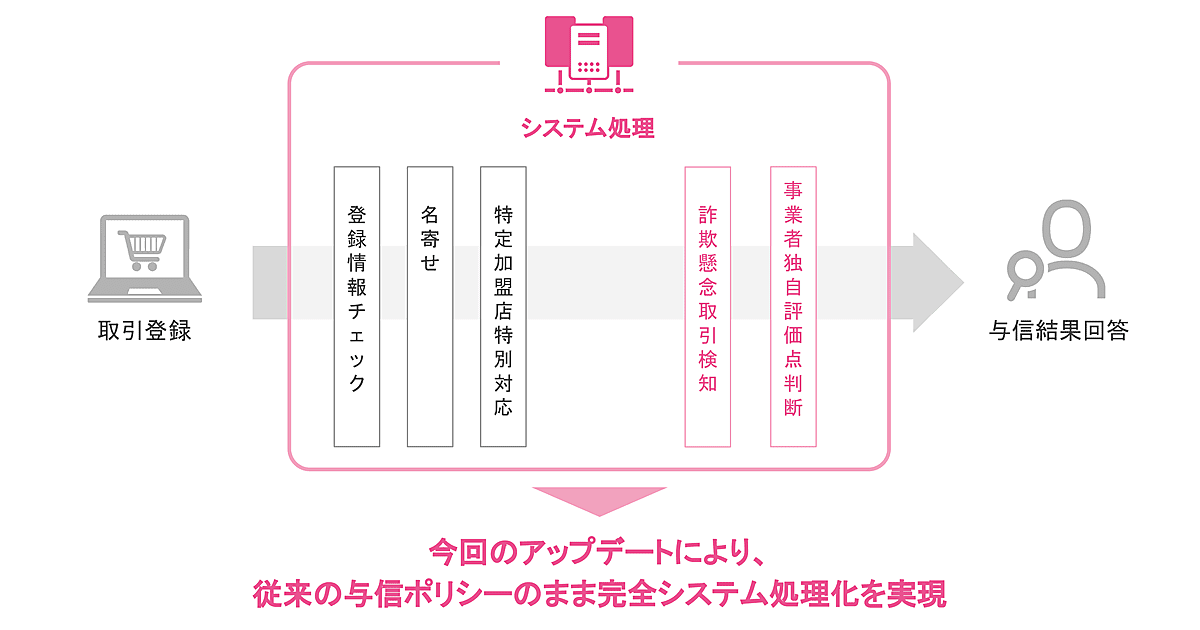 また、これまでは一部の取引情報と決済情報のみを活用してきたが、今後は商品明細情報などを含め、内部データをフル活用し、外部データともシステム処理を自動化。不正検知能力が向上することでで、これまでNGを出していた取引の中にもOKが出せるものが増えることになり、与信通過率向上する。