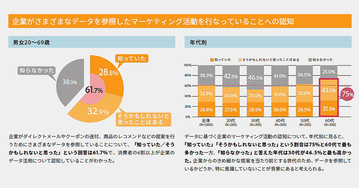 企業がダイレクトメールやクーポンの送付、商品の提案などを行うために、ユーザーのさまざまなデータを参照していることについて、「知っていた/そうかもしれないと思った」という回答は61.7%と、消費者の6割以上が企業のデータ活用について認知していることがわかった。