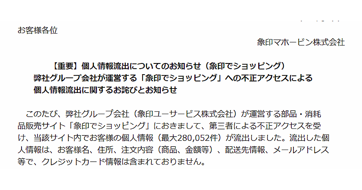 「象印でショッピング」において買い物をした顧客情報が最大で約28万件が流出。流出したメールアドレスには、改ざんしたサイトへ誘導するためのリンクを設置したメールが送信されており、クレジットカード情報を入力した一部顧客のカード情報が不正に搾取された可能性があることも判明している