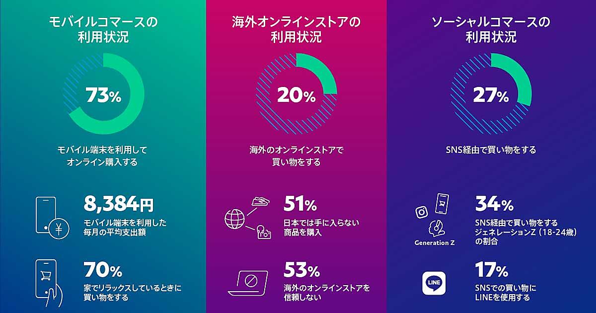 日本、アメリカ、イギリス、ドイツ、フランス、イタリア、スペイン、オーストラリア、ブラジル、メキシコ、インドの11か国の消費者22,000人と事業者4,600社を対象に、PayPal(ペイパル)が「モバイル端末」「越境EC」「ソーシャルコマース」の利用状況について調査し、その結果を発表した。