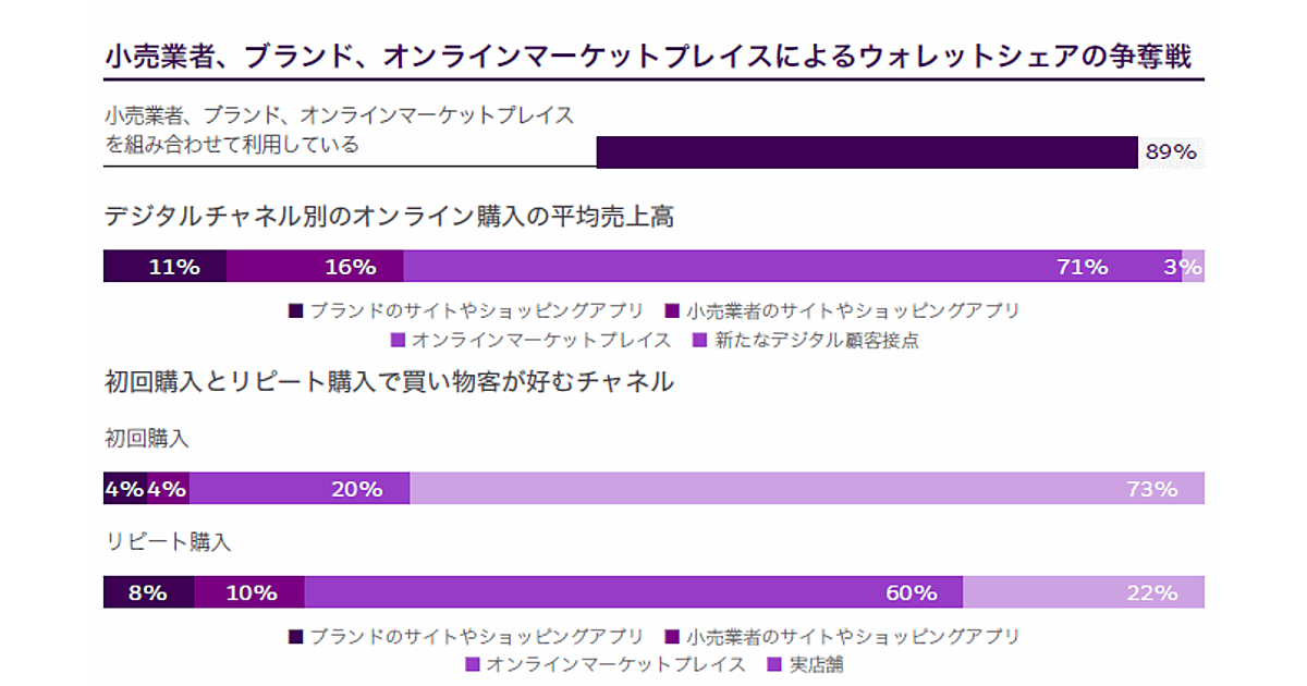 消費者は常時インターネットに接続された状態にあり、個客に焦点を当てパーソナライズされたエンゲージメントや、ブランドによる消費者への直接販売といったビジネスモデルが活用されている。そうした状況の中、日本の消費者の89%は、小売業者、ブランド、オンライン市場の3つの販路で商品を購入している。