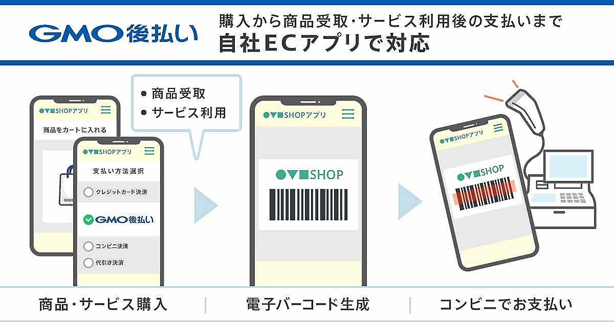 GMOペイメントゲートウェイ(GMO-PG)の連結会社であるGMOペイメントサービスは2019年12月25日から、後払い決済サービス「GMO後払い」を導入するEC事業者向けに、自社のECアプリ上でコンビニ支払い用の電子バーコードが発行できる「スマホアプリタイプ」の提供を始めた。