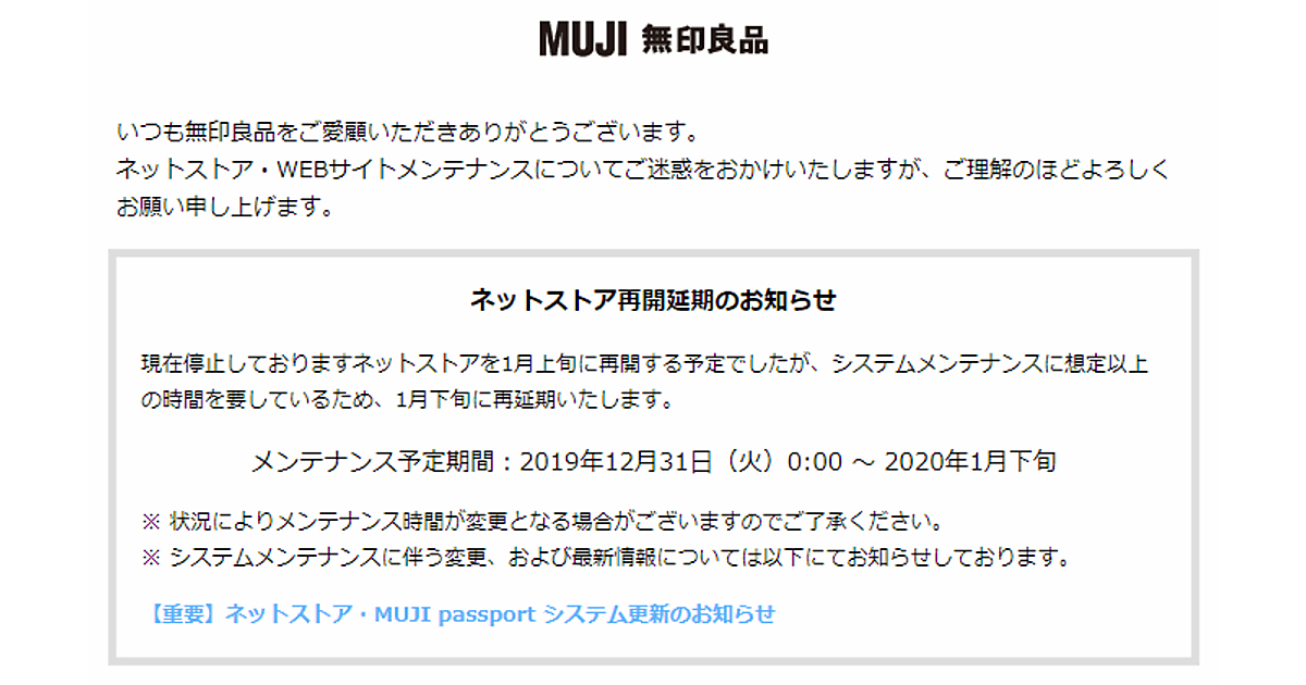 「ネットストア」および「MUJI passport」アプリは当初、2019年12月31日0時~2020年1月1日13時の期間で、システム更新に伴うメンテナンスを行う予定だった。
