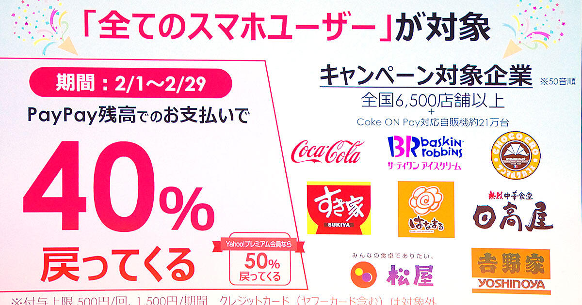 キャンペーンの対象となる店舗は吉野家やはなまるうどん、サンマルクカフェなどの実店舗に加え、コカ・コーラの公式アプリ「Coke ON」対応の自動販売機。支払時にPayPayを利用すると支払金額の40%が後日付与される。 また、Yahoo!プレミアム会員は50%付与される。