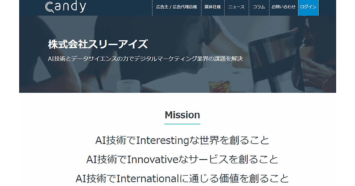 出資するスリーアイズは、Cookieをベースとしたネット広告事業者とは異なり、コア技術である自然言語解析によって、Web上の自然言語・一般知識・トレンドを理解するAIが、高精度なコンテンツマッチングを行うネット広告配信サービス「Candy」を提供している