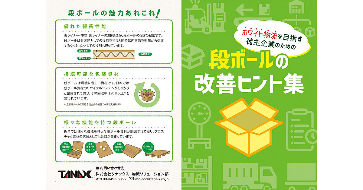 タナックスは、荷主企業のホワイト物流推進を段ボール改善という切り口からサポートするためのリーフレット「ホワイト物流を目指す荷主企業のための段ボールの改善ヒント集」を発行した。