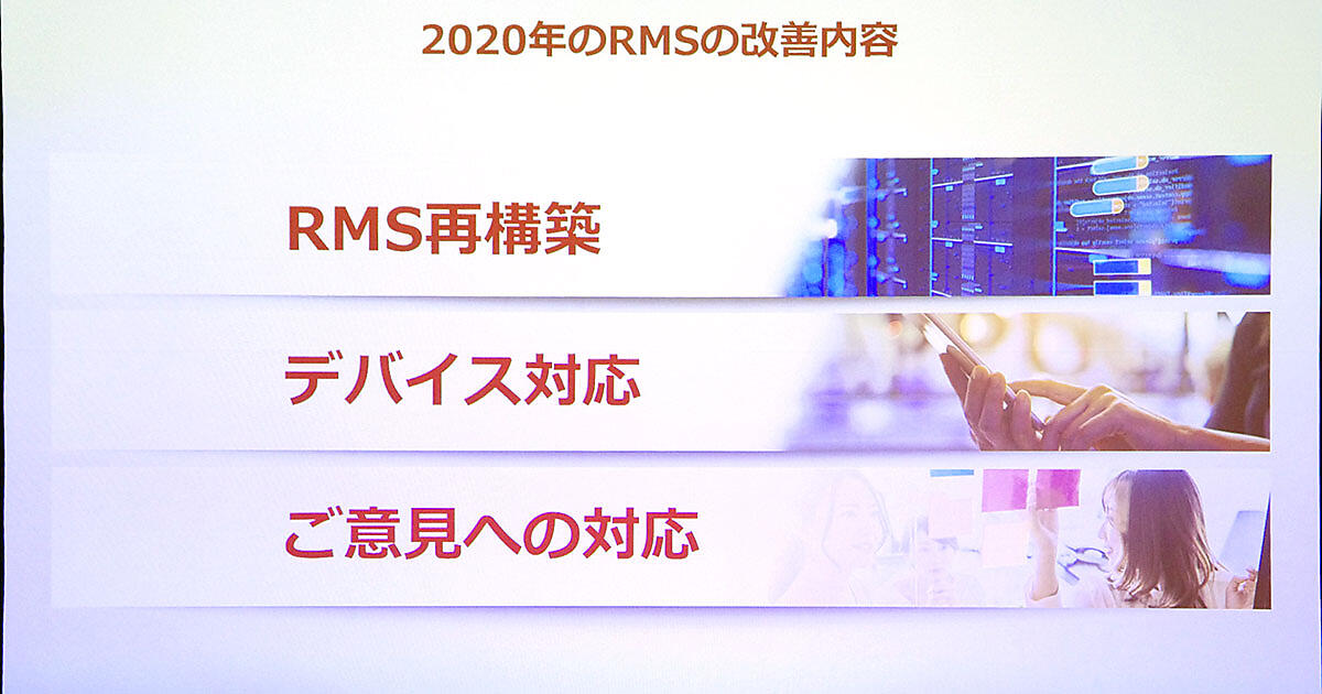 2020年上期の施策について、「RMSの再構築」「デバイス対応」「店舗意見への対応」の3つを大きな柱にあげた。