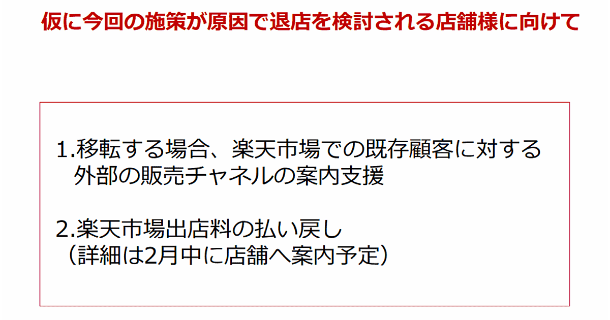 2月13日に楽天が開いた決算説明会で三木谷浩史会長兼社長は、「(「楽天市場」での運営が)厳しいという店舗にはお助けできないかなと。Amazonやヤフーに移るのであれば『移転しました』と表示する。自社ECサイトを開いたのであれば通知もする」と説明した。