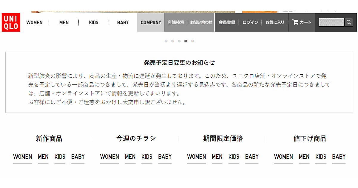 ユニクロは店舗やオンラインストアで発売予定の一部商品について、発売日が当初より遅れる見込みだと公式サイトで告知。新型肺炎の影響で、商品の生産と物流に遅れが発生しているという。
