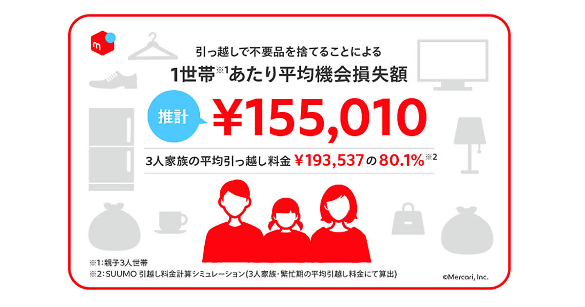 引っ越し時に捨てた不要品の数量をカテゴリー別に聞き、「引っ越し時に何かしら捨てた」と回答した944人(世帯)の1人(世帯)あたりの平均処分数量を算出。さらにメルカリにおける平均取引価格と平均処分数を掛け合わせ、1世帯あたりの平均機会損失額を算出した結果、推計で155,010円だった。