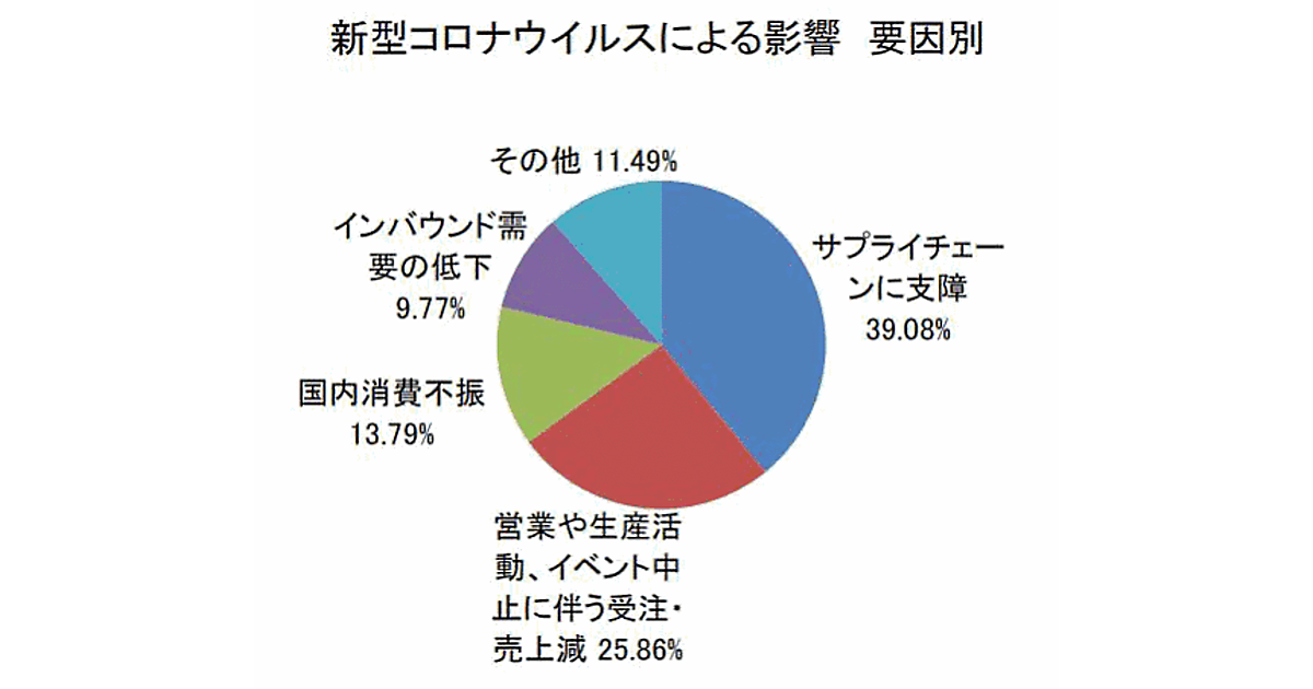 このほか、「国内消費不振」が13.7%、「インバウンド需要の低下」が9.7%と続き、物販や観光業など、外出抑制で消費マインドの冷え込みを懸念する声も多かった。感染拡大に伴い、旅行や会合などの自粛も相次いでいる。
