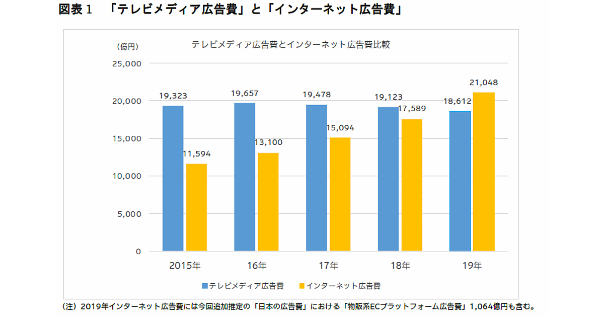 電通が3月11日に公表した「2019年 日本の広告費」によると、2019年1~12月における「インターネット広告費」は前年比19.7%増の2兆1048億円だった。