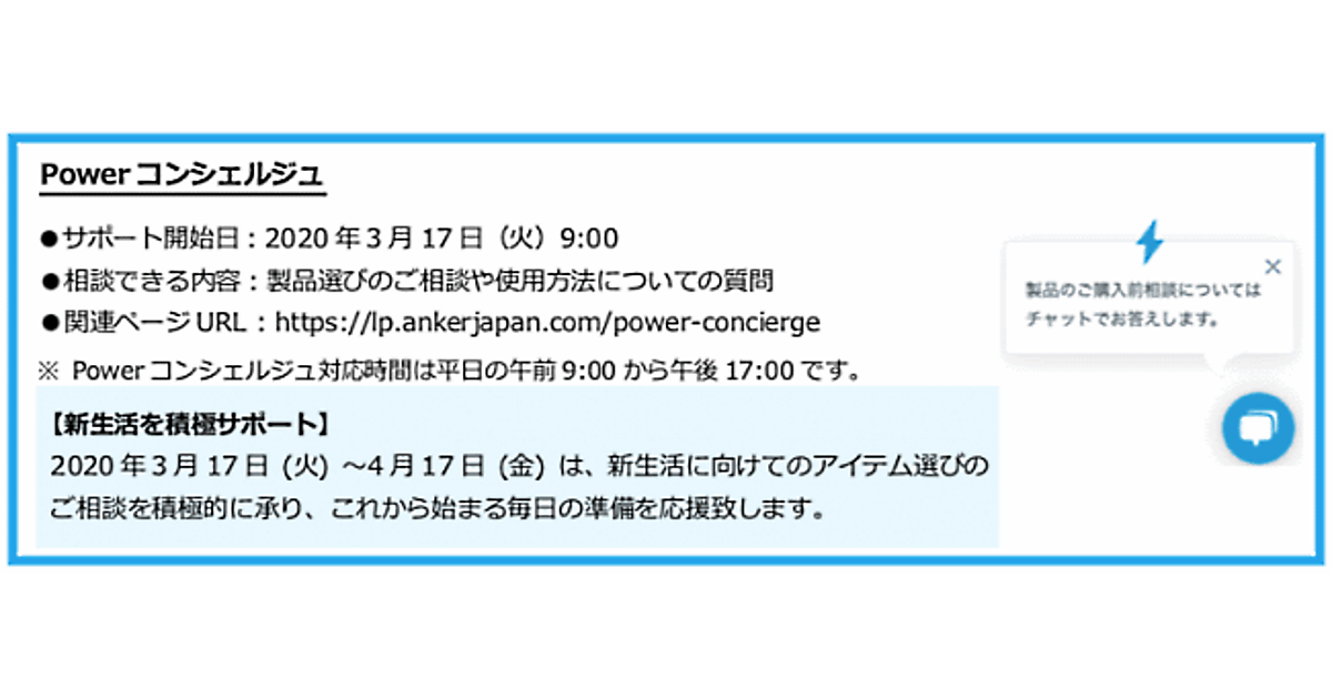 モバイルバッテリーやオーディオ製品などを販売しているアンカー・ジャパンは3月17日、Anker公式オンラインストアで有人のチャットサポートを開始した。カスタマーサポートスタッフが顧客の希望をリアルタイムで聞き取りながら、会話形式で商品の選び方や使い方を教える。