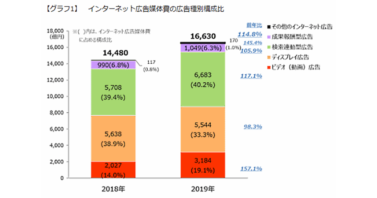 「ビデオ(動画)広告」は前年比57.1%増の3184億円と大きく伸長し、全体の19.1%。「成果報酬型広告」(6.3%)、「その他のインターネット広告」(1.0%)と続く。