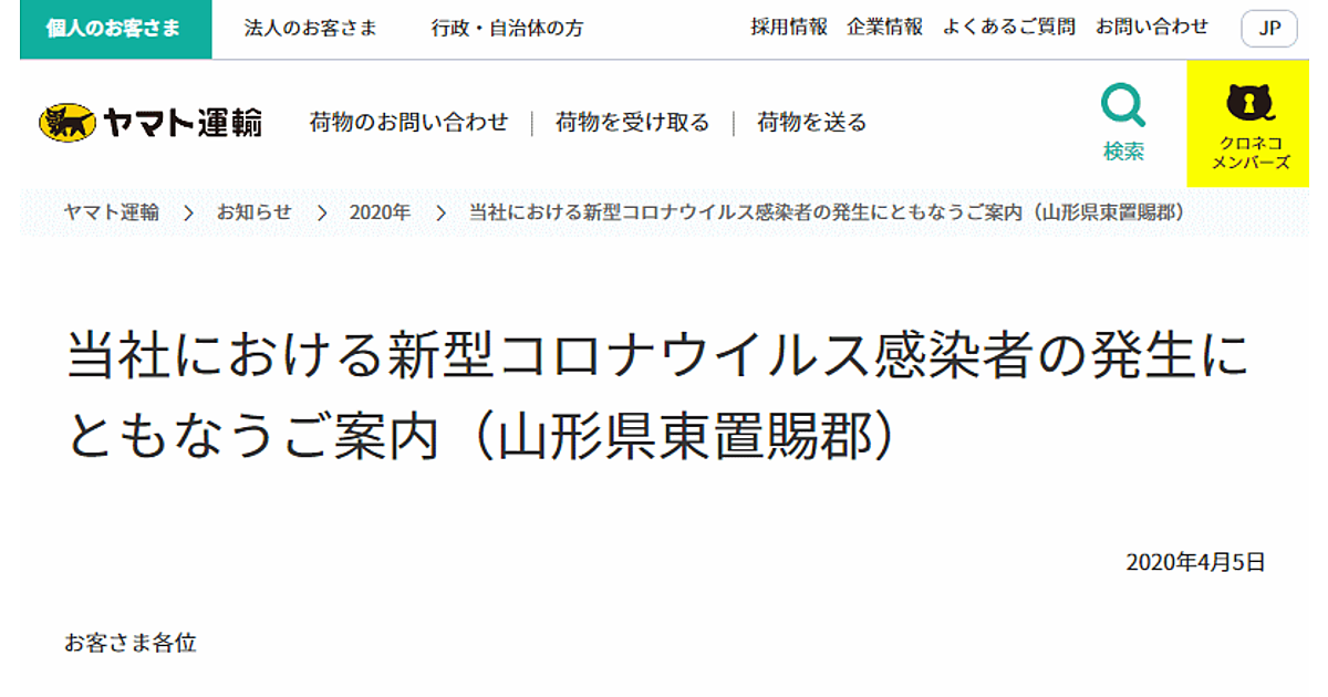 ヤマト運輸は4月5日、山形主管支店南陽支店(山形県東置賜郡高畠町)に勤務し、集配を行うセールスドライバーの社員1人(20歳代)が新型コロナウイルスに感染したことが判明したと発表した。