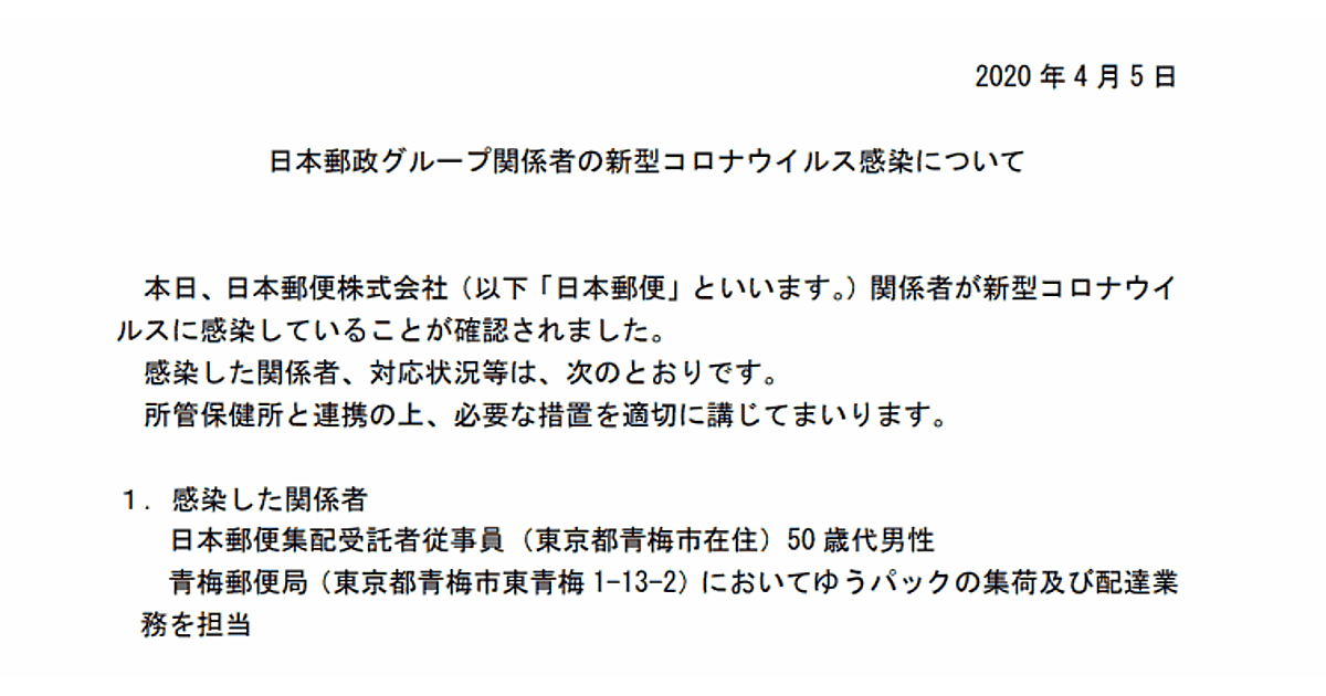 日本郵便は4月5日、東京・青梅郵便局(東京都青梅市東青梅)に勤務し、ゆうパックの集荷・配達業務を担当する集配受託者従事員が新型コロナウイルスに感染したことが判明したと発表した。