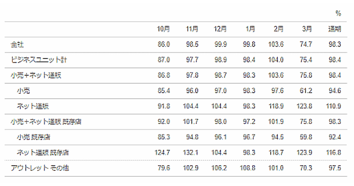 新型コロナウイルスの感染拡大に伴う営業時間の短縮や、都内の店舗を中心に最終週の週末の営業を自粛したことなどにより、実店舗の月次売上高は同38.8%減と大幅に落ち込んだ。実店舗の3月の買上客数は同36.0%減、客単価は同4.3%減。